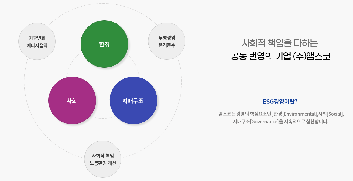 3. ㈜앰스코는 자사의 모든 임직원을 포함하여 다양한 이해관계자들의 기대에 부응하고,당사의 지속가능한 성장을 추진하기 위하여 ESG 경영을 추진한다.